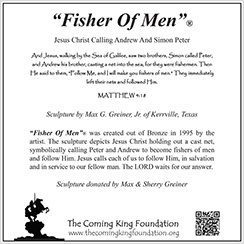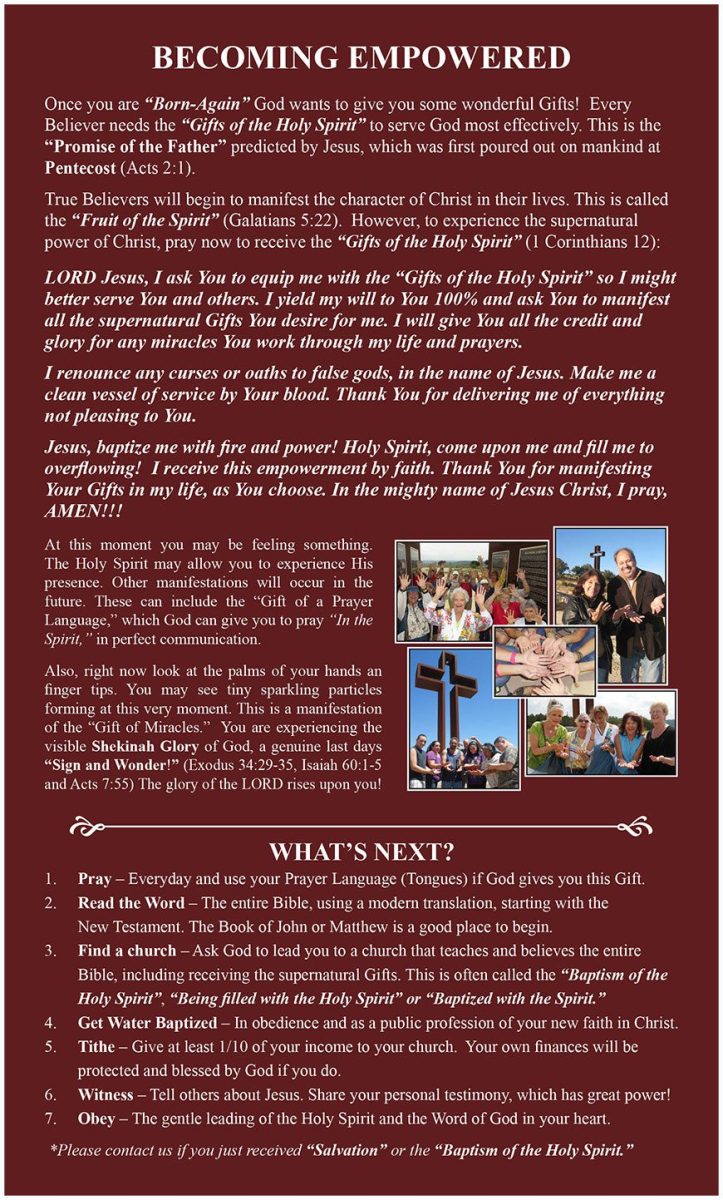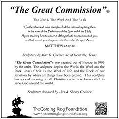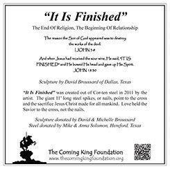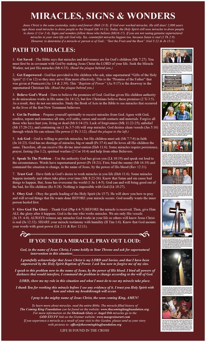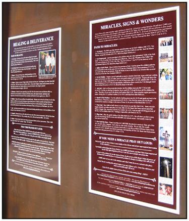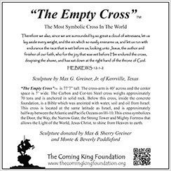 At the foot of the cross visitors are given the opportunity to pray to receive Jesus Christ as LORD and Savior, to be filled with the Holy Spirit, to be healed and to pray for the miracles needed in their lives. The words and prayers written on the four plaques were given to artist/evangelist, Max Greiner, Jr. by the Holy Spirit.